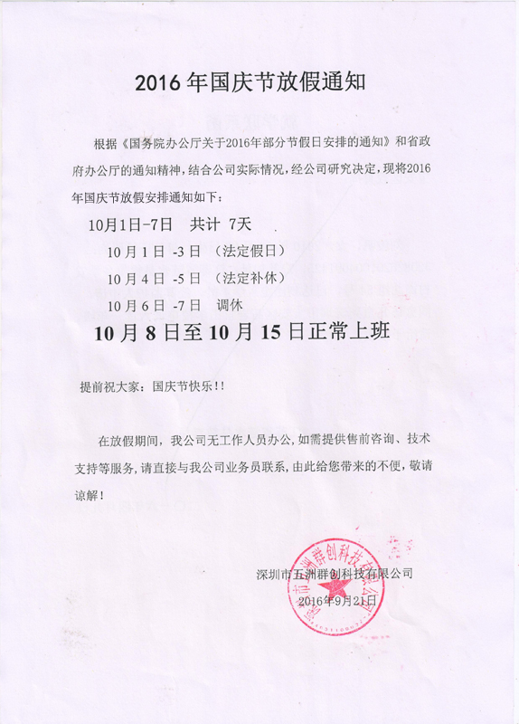 為方便大家的工作安排,現將我司2016年中秋節放假安排如下: