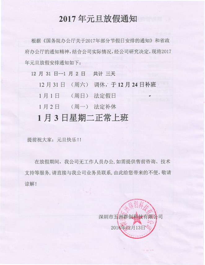 為方便大家的工作安排,現將我司2017年元旦放假安排如下: