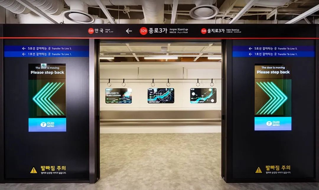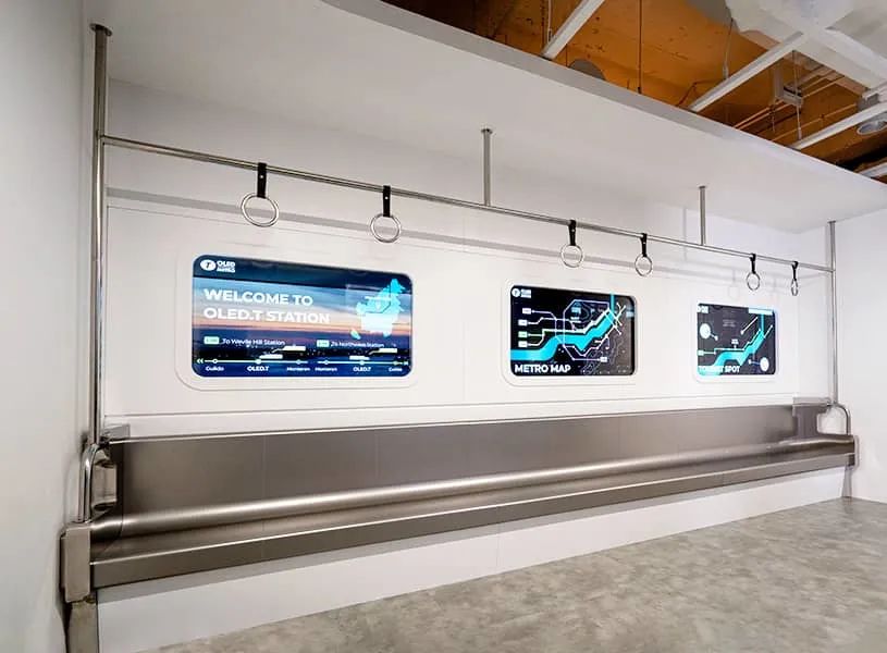 通過將透明OLED裝置在窗戶、或站臺屏蔽門上,可以讓旅行者在欣賞窗外自然景色的同時,享受透明OLED呈現的各種內容,以便接受更多必要信息,如交通、旅游信息和地圖等。