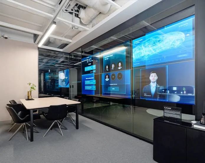 在辦公空間,透明OLED屏幕代替了傳統的會議室玻璃墻,在會議時,透明OLED可以化身屏幕顯示重要信息,當需要隱私時,透明OLED也可以轉換為遮擋模式,提高會議的隱私性。