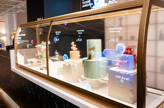 零售空間的T-Facade和Cake Showcase,可以通過透明OLED直觀地傳達產品信息并提供品牌視頻的曝光,呈現傳統顯示器無法實現的未來品牌內容體驗。