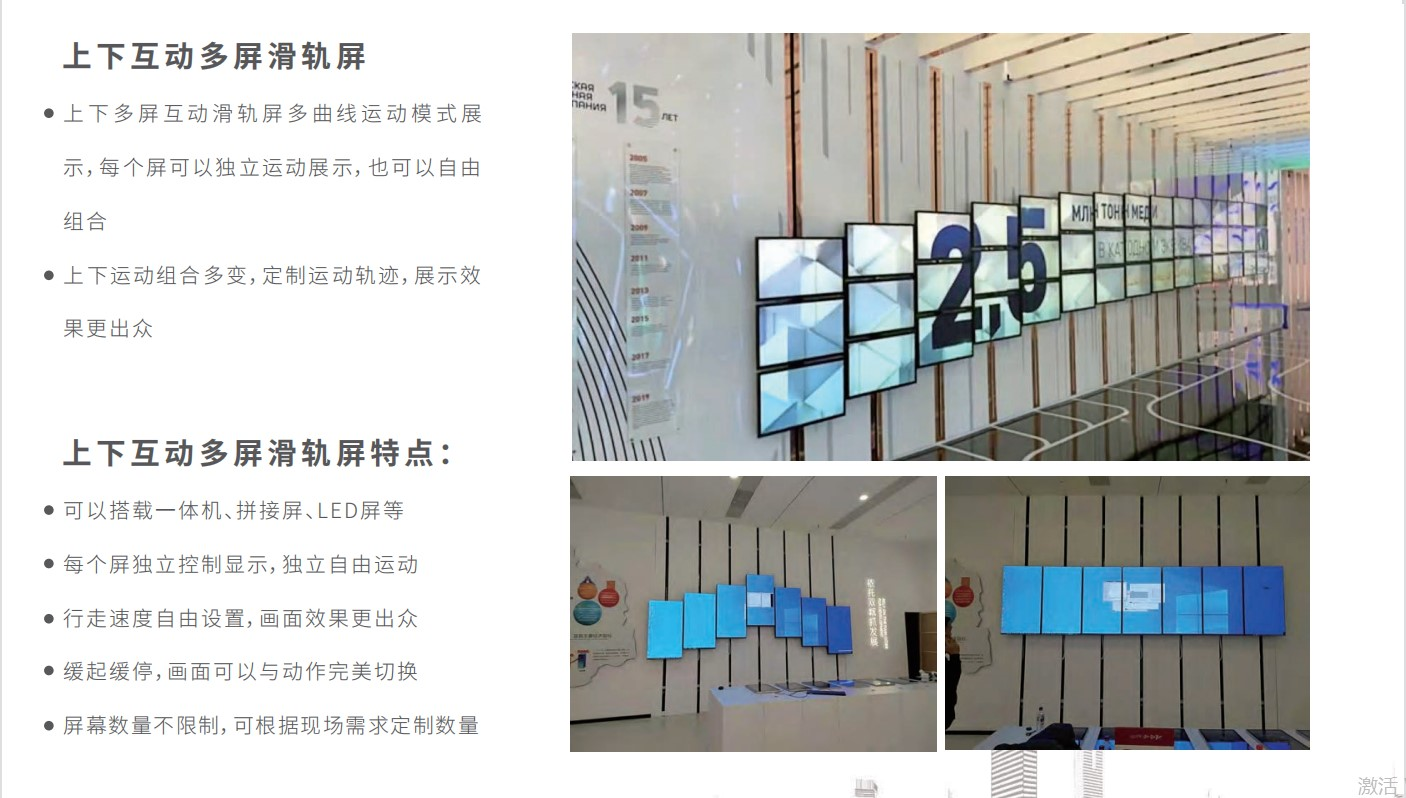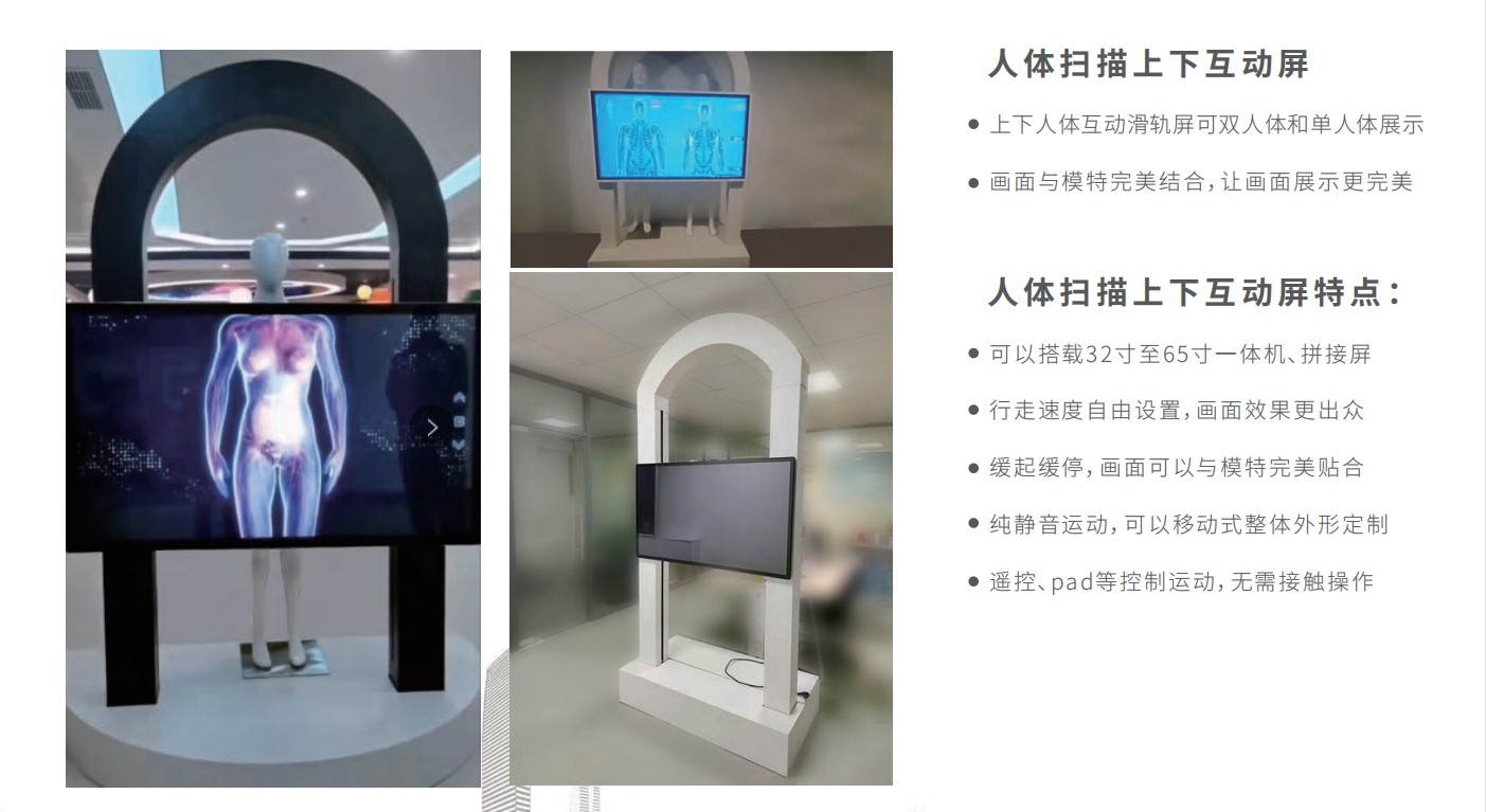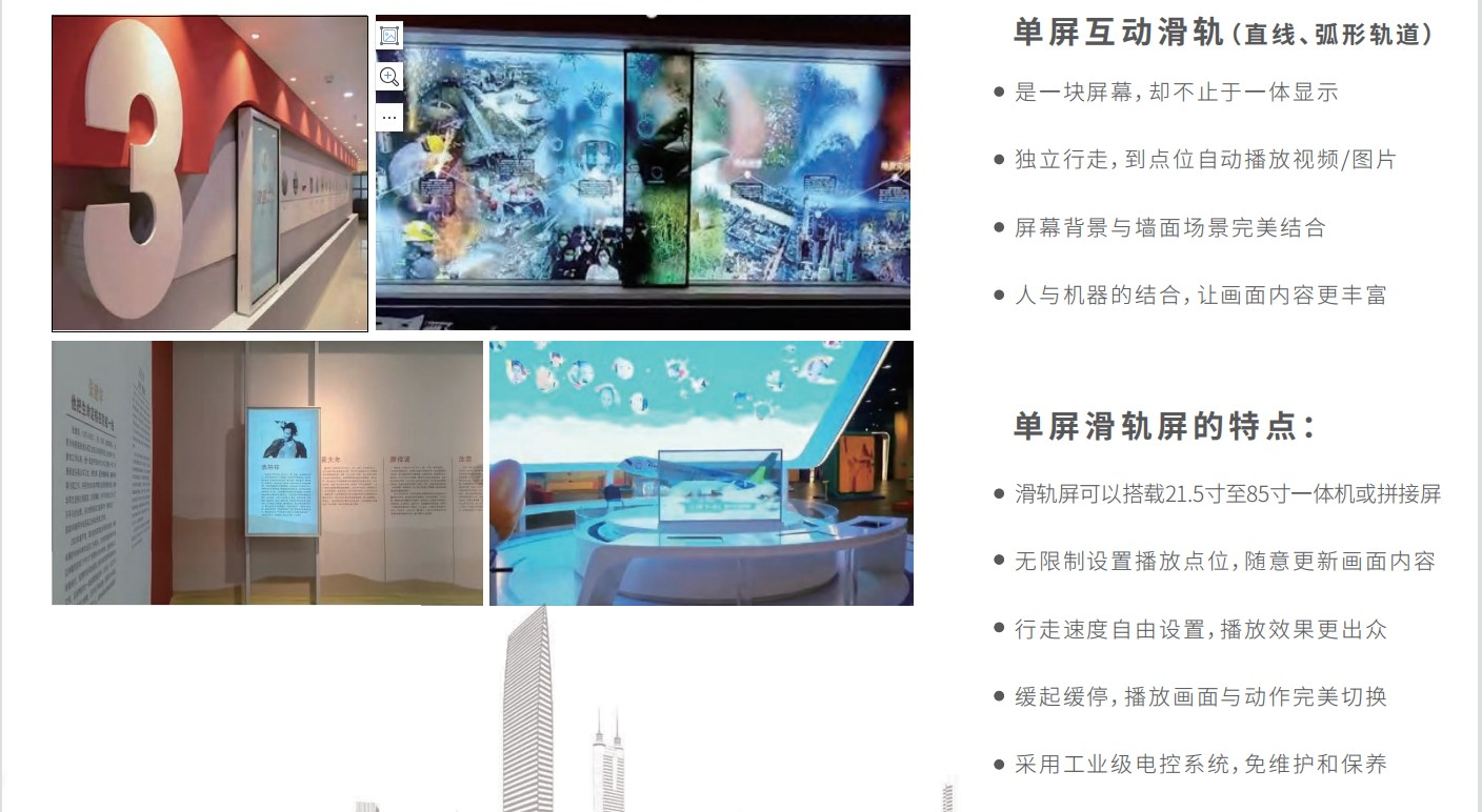 滑軌互動屏又稱滑軌電視,由軌道、電子顯示屏幕、紅外感應器、燈箱、主機等組成,可以上下左右控制顯示屏,當電子屏幕移動到預定點位時,將自動播放該部分的視頻內容并與觀眾產生互動。顯示屏可以選擇LED、透明屏、拼接屏等不同顯示設備,根據客戶需要定制。圖像根據手指的動作進行放大、縮小、旋轉等,同時還可以自動巡航。智能滑軌互動屏就是可以在軌道上滑行的顯示屏幕。