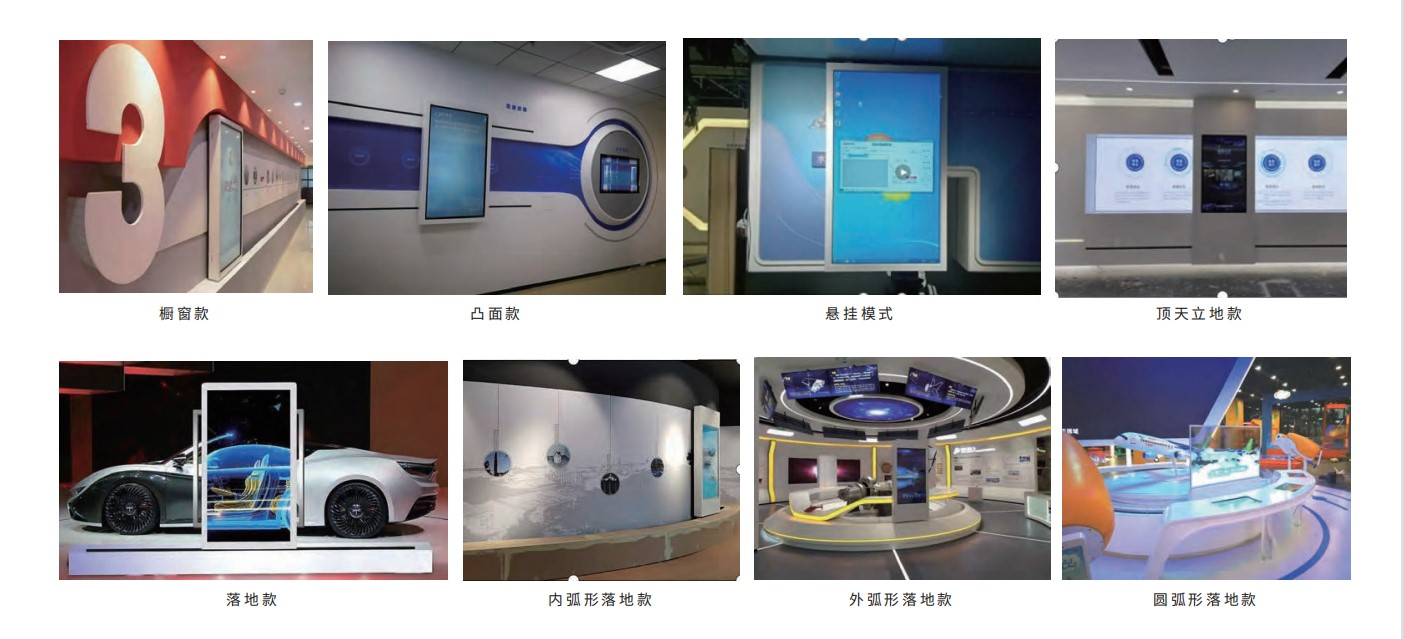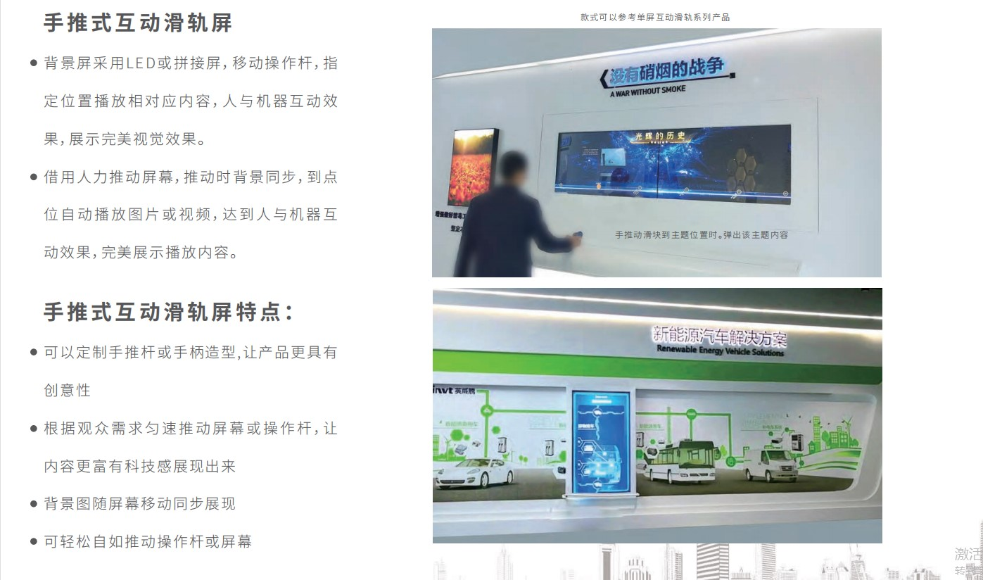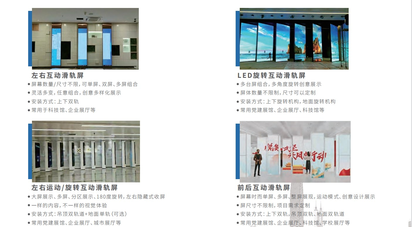 通過特殊設計機械滑軌控制裝置,結合高清液晶拼接幕墻,實現對屏幕內容的互動控制,在相應位置上設置不同的觸控點,預先在滑行的軌道上安裝好傳感電路裝置,當推動顯示屏到感應點時,傳感信號就會被觸發,那么顯示屏上就會自動切換到相應內容。