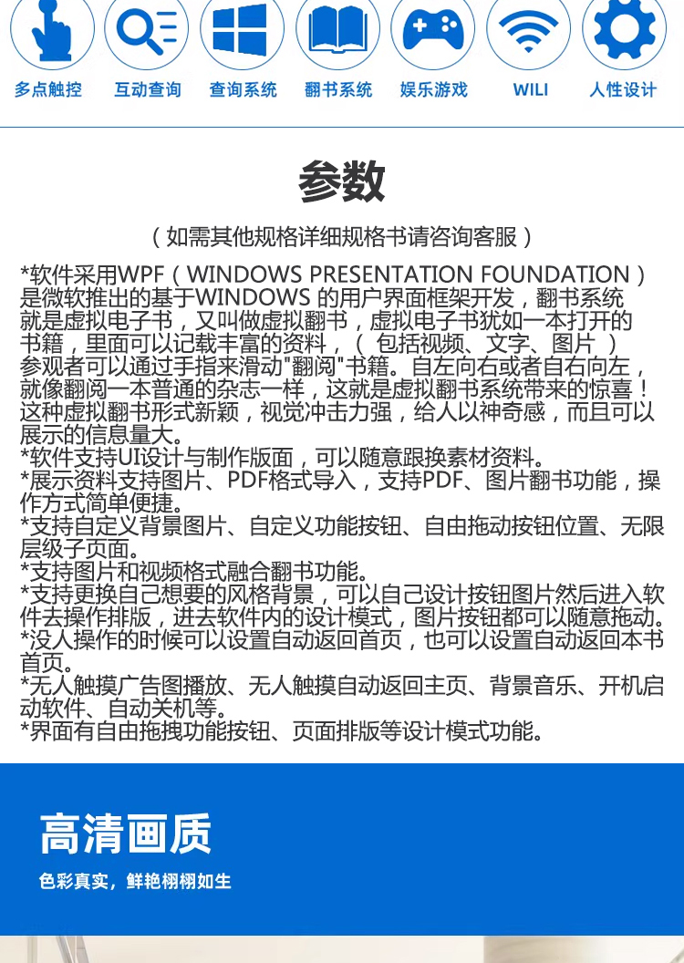 五洲視界電子翻書機空中虛擬觸摸落地觸控屏查詢一體機,采用了多點觸摸技術與Windows完美結合,實現了多點觸摸和多種手勢動作識別,充分體現了人機交互的獨特魅力。它適用于各種場所,如展示宣傳查詢:在企業前臺或展廳、銀行金融、酒店大廳、商務企業、售樓大廳、地產中介汽車4S店、家具和藝術品專營店、電影院、寫字樓和公寓大廳、銀行等金融機構、電信 、政府機關單位 、購物中心、公司接待室或會議室、展廳會場設計公司,展會現場等進行產品或服務展示宣傳查詢。同時,它也支持定時開啟屏保功能,更換屏保內容同樣方便。五洲視界電子翻書機空中虛擬觸摸落地觸控屏查詢一體機,以人性化的設計,為人們提供了便捷、快速的查詢通道,將智能化社會帶入了我們的生活。