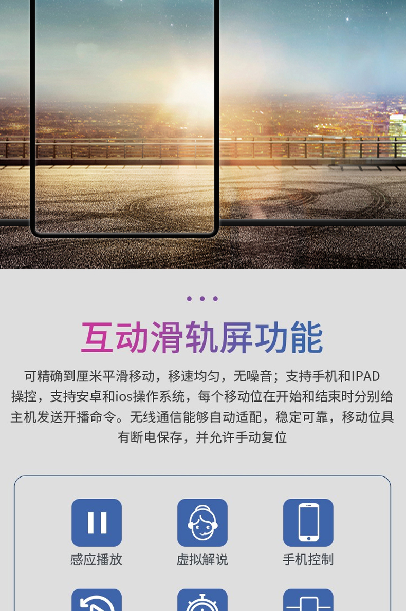 3) 電機與編碼器,減速器一體集成 4) 移動速度均衡,聲音很小 5) 支持左右定點停止功能 6) 支持隨意停止功能 7) 支出中途斷電記憶功能 8) 支持無人操作,自動往返模式 9) 支持左右長移模式 10) 支持電機移動,速度更改 11) 支持多定點內(nèi)容展示和實習內(nèi)容展示 12) 支持手機或者pad ipad遠程控制 13) 可拉動重量在150公斤以內(nèi)