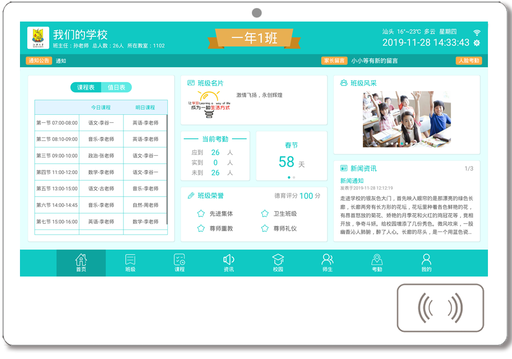 A、基礎(chǔ)公共信息:包括學(xué)校名、學(xué)校Logo、班級名稱、班主任、班級人數(shù)、當(dāng)天考勤統(tǒng)計、時間,天氣等信息;