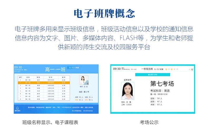 智慧班牌是數(shù)字化智慧校園建設(shè)不斷發(fā)展的產(chǎn)物,是教育信息化改革的部分體現(xiàn)。它包含以往班牌優(yōu)點的同時,還綜合考慮教改及學(xué)校各方面的需求,加入了更多的實用功能,比如:顯示班級及教室基礎(chǔ)信息、當(dāng)前日期和時間、以及由傳感器采集的實時數(shù)據(jù),同時顯示多端平臺數(shù)據(jù)同步,具有多樣性的交互功能。