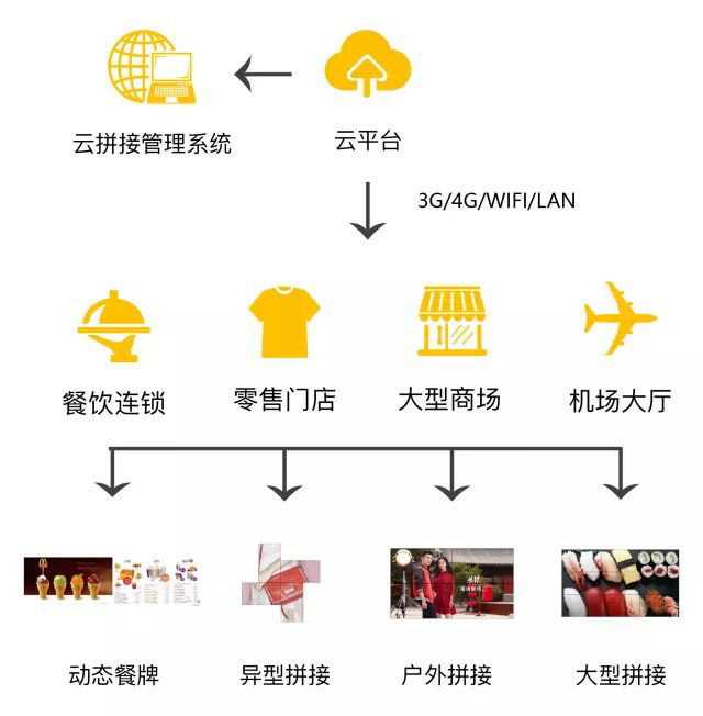 五洲智能云拼接通過云計算技術,融合各種大屏顯示硬件設備,以后臺管理系統為核心,無需拼接控制器等設備,基于互聯網分布式處理,實現各種視聽顯示需求,廣泛應用于餐飲、零售門店、商場等公共領域。